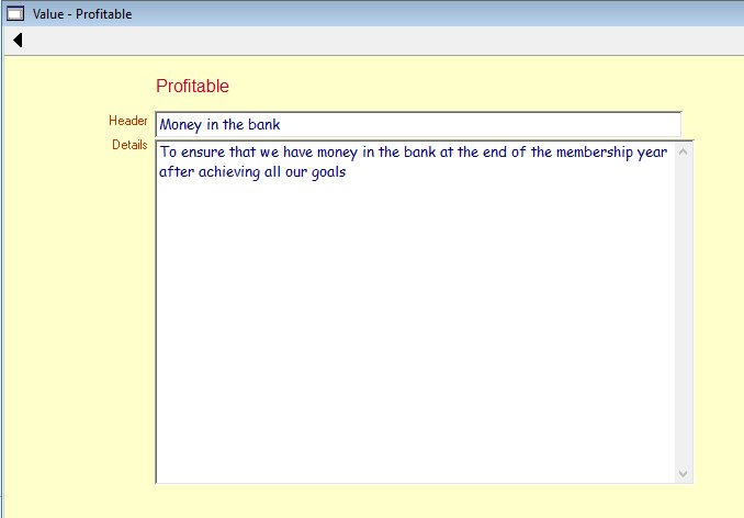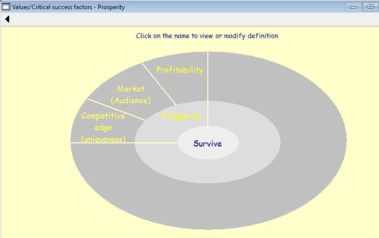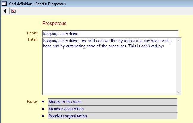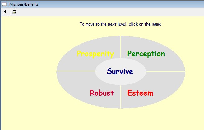On clicking on the words 'Missions/Benefits' from the previous menu the information architect will be presented with the following screen: ![]() This screen displays the anatomy of the 'Benefits' complex evolving object which is subdivided into the; Prosperity; Robust; Esteem; and Perception statements. Note the acronym PREP which produces the phrase 'PREPare your Benefits'. By clicking on any of the benefit tags, the RA1 will be able to assist the 5 chief officers (COs) define and record the four benefit statements. The menu bar will enable the architect to print the results The following screen shows the 'Prosperity' benefit: ![]() Using these screens the RA1 can work on each 'Benefit' statement as well as their associated Value statements. The following screen shows the 3 'Value' statements associated with the 'Prosperity Benefit': ![]() The RA1 together with the 5 COs will be able to define and record each of the 'Values' supporting their appropriate 'Benefit'. The following screen shows how this is achieved: ![]() |