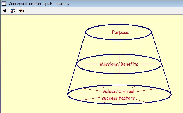 This screen displays the hierarchical anatomy of the 'Goals' complex evolving object which is subdivided into the; Purpose statement; Benefits (Mission); and Values (critical success factors).. The menu bar will enable the architect to get a 'helicopter view' of all the objectives stored within the repository or to proceed to the SWOT analysis section. |