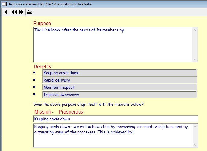 This screen displays the 'Purpose statement' (the simple static object). The menu bar will enable the architect to modify the statement, to scroll trough the 4 benefit statements to ensure the purpose statement satisfies them and to print the purpose. |