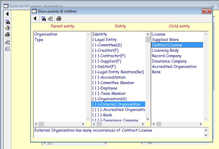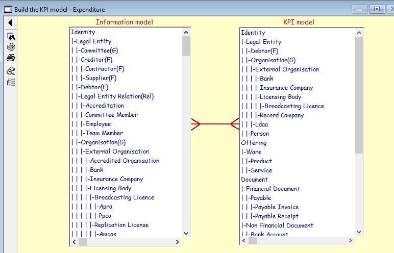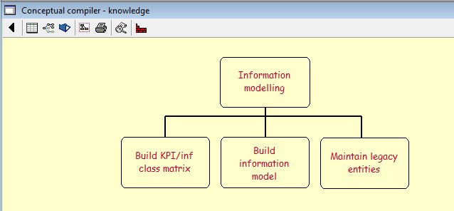 On clicking the word 'Knowledge' from the Conceptual compiler menu, the information architect will be presented with the following screen: ![]() This screen displays three tactics used to build the enterprise's knowledge base. The build KPI/inf class matrix is rarely used but has been included for historical purposes. This matrix is built automatically during the Build information model phase. On selecting the Build information model tactic, the following screen will be displayed: The RA2 together with the CO will select a value (usually starting with the weakest) and then select a performance indicator. On doing so the following screen will be displayed: ![]() The KPI/knowledge model is built by selecting an entity in the existing knowledge base and on doing so it, together with its hierarchical dependencies, will be added to the KPI model. By selecting any entity in the Information model, additional entitles can be defined and linked to the KPI model. These new entities will be made available to other RA2s should they be working simultaneously, hence avoiding redundancies. One of the strengths of Caspar is its ability to automatically create the hierarchical link between the adult entity and its sibling. However it requires the RA2 to create a network of entitles by linking one entity to the multiple occurrences of another. This is done by selecting the Create association feature from the drop down menu after selecting the entity of interest. The following screen displays this function: |