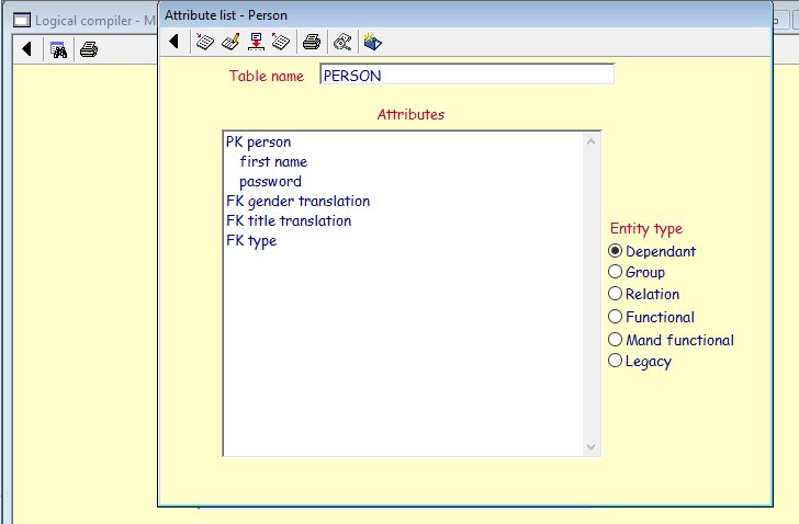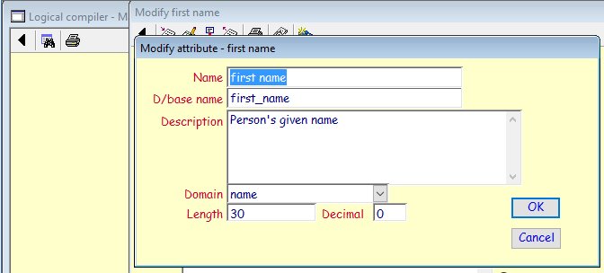 The only entitles that will appear in this list are those that the RA5 selected to become logical. To add or modify attributes, the RA6 will need to double click on an entity name and the following screen will be displayed: ![]() You will note that the surname does not appear in this entity as Person is a subset of Legal entity and hence the surname is actually the legal entity name. When the actual data base is generated and if the legal entity is ignored as a physical table, the legal entity name attribute will be automatically relocated to the person table. If the RA5 wants to make any changes to the attribute, then the following screen will be displayed: