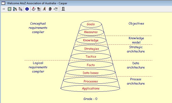 The display of this screen will depend on the level of the Ripose architect using Caspar. In this example the RA0 architect signifies access to all sections. The menu bar at the top contains all the available functions. In addition functions can be activated by hovering the cursor over the appropriate name or by pressing the right mouse button, in which case a pop up menu will appear. |